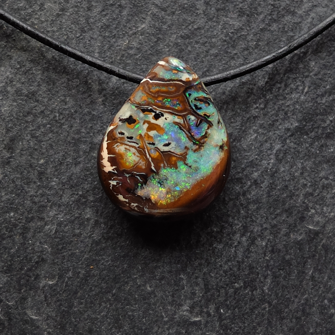 Ein Teil einer Opalnuss mit wildem Muster...zu tragen am Lederband