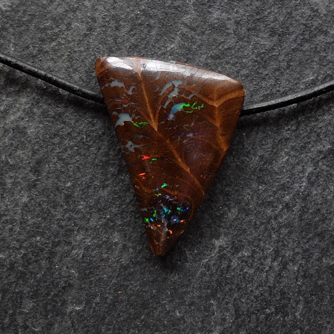 Die satten Farblinien scheinen durch ihr Gewicht nach unten zu sinken...zu tragen am Lederband.