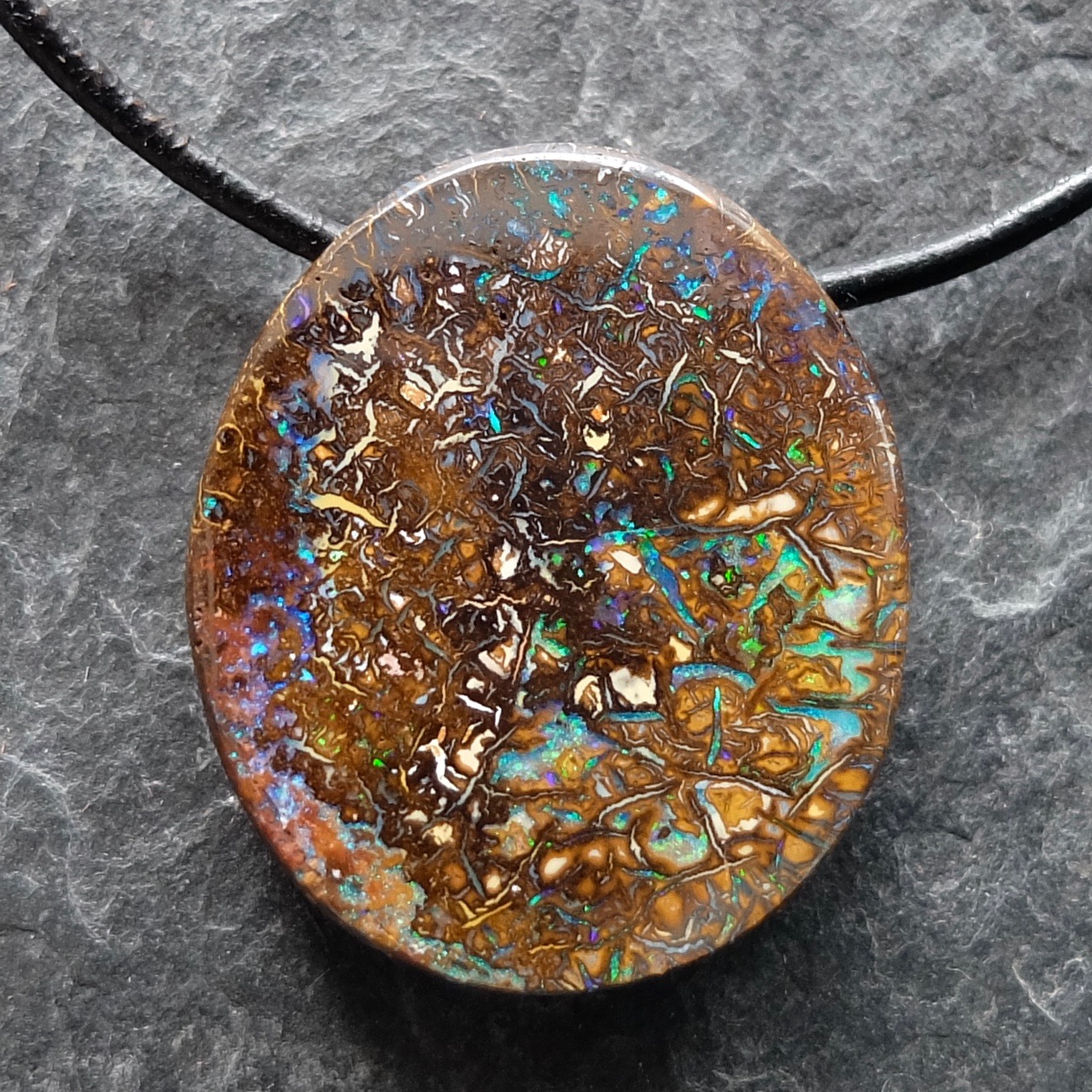 Zartes Muster in blau und grün...wie das Flirren einer Frühlingswiese...zu tragen am Lederband.