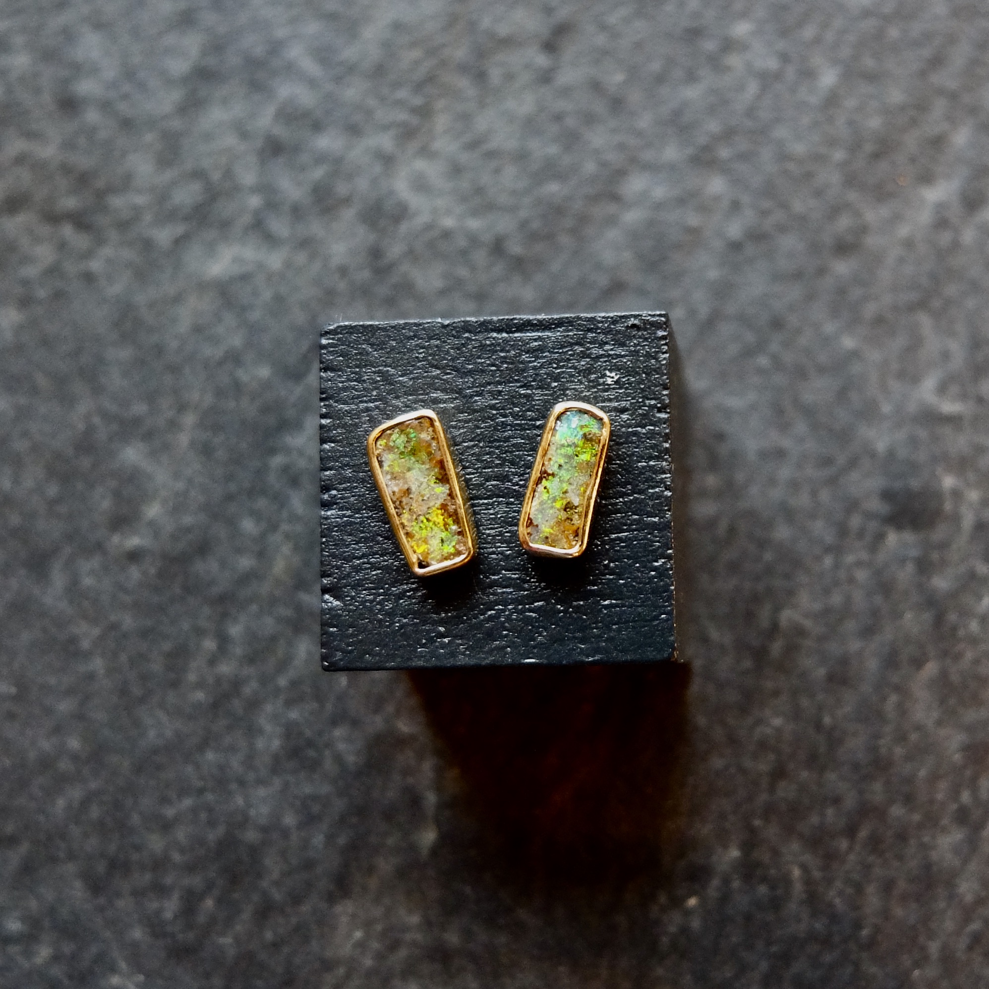 Ohrstecker aus 750er und 900er Gelbgold, Boulderopale. Es ist eine individuelle Goldschmiedearbeit.