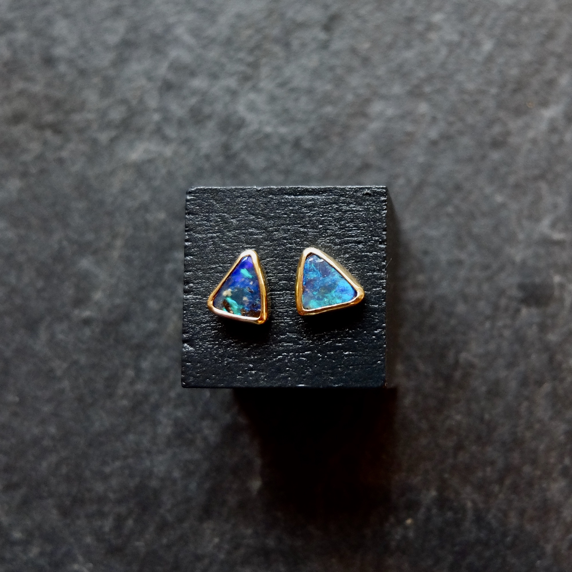 Ohrstecker aus 750er und 900er Gelbgold, Boulderopale. Es ist eine individuelle Goldschmiedearbeit.