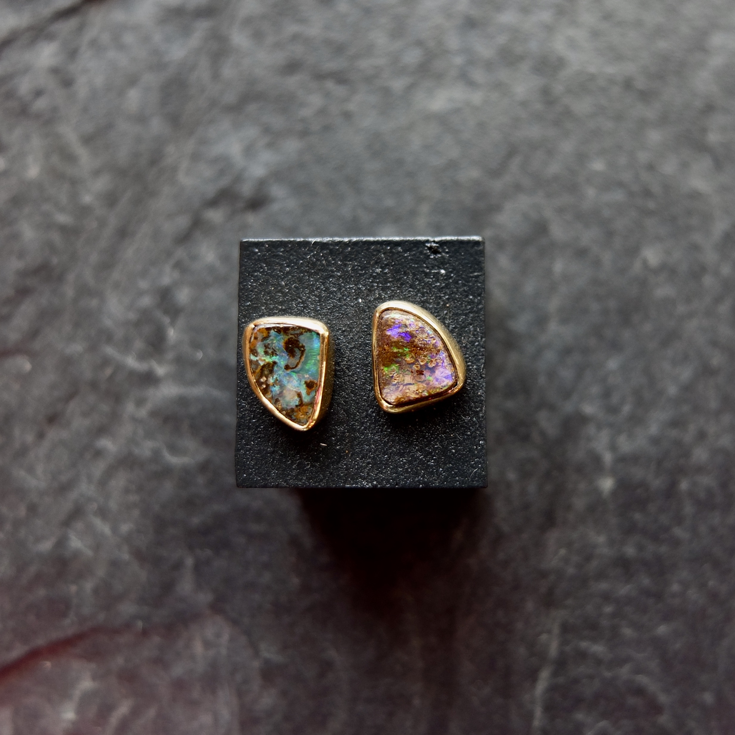 Ohrstecker aus 750er und 900er Gelbgold, Boulderopale. Es ist eine individuelle Goldschmiedearbeit.