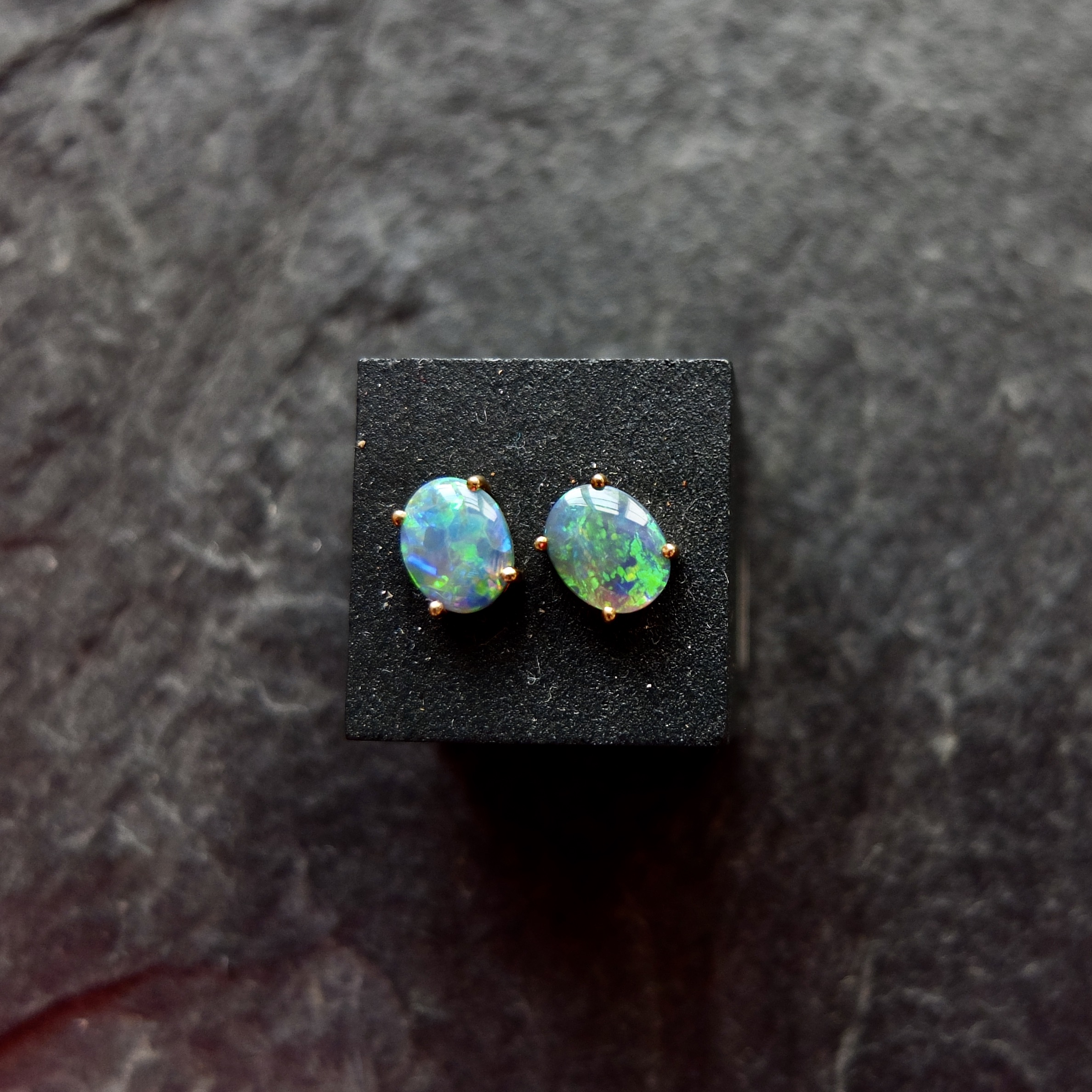 Ohrstecker aus 585 Gelbgold, wunderschöne Schwarzopale. Es ist eine individuelle Goldschmiedearbeit.