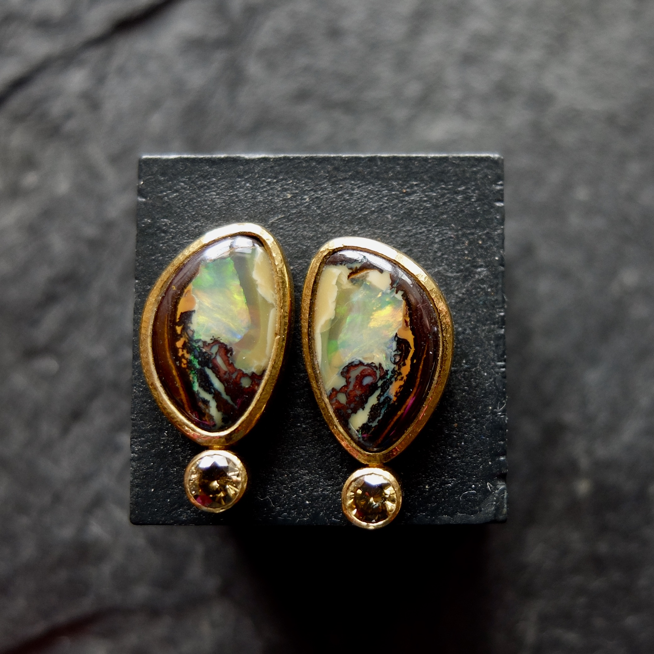 Ohrstecker aus 900er und 750er Gelbgold, Nussopale, Brillanten fancy 0,3cts (natürliche Farbe). Es ist eine individuelle Goldschmiedearbeit.