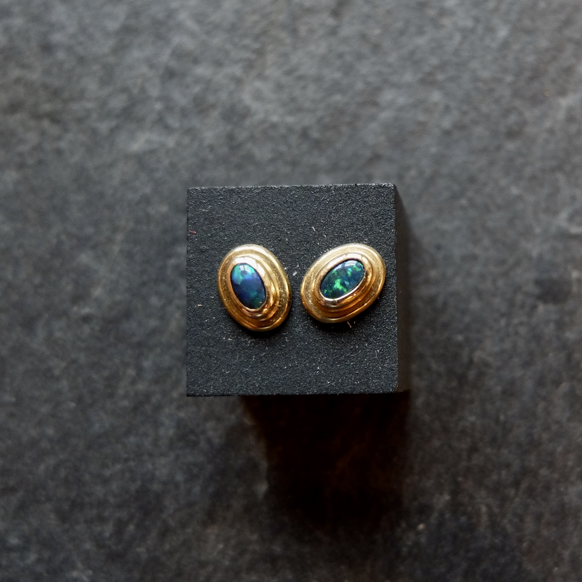 Ohrstecker aus 750er Gelbgold, Schwarzopale. Es ist eine individuelle Goldschmiedearbeit.