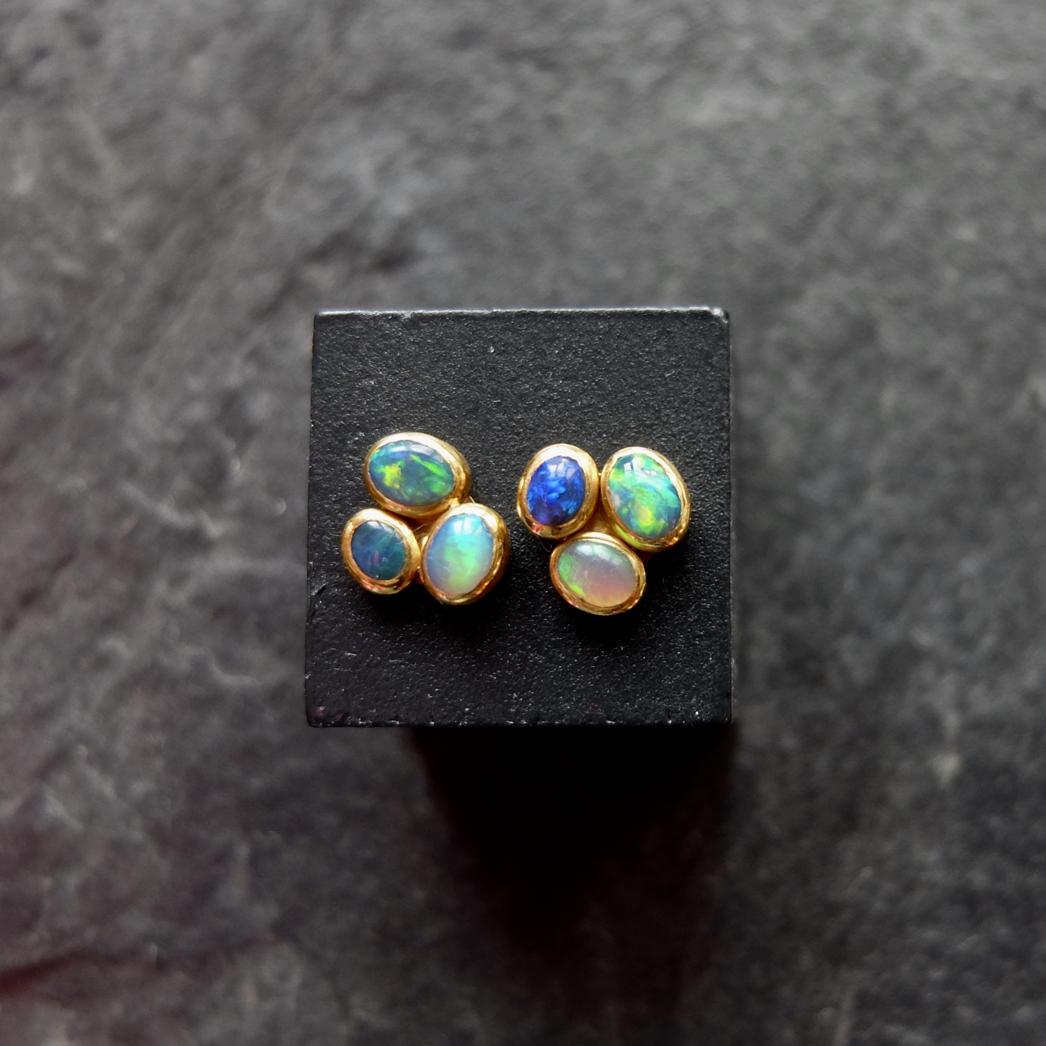 Ohrstecker aus 750er Gelbgold, 6 schwarze Opale. Es ist eine individuelle Goldschmiedearbeit.