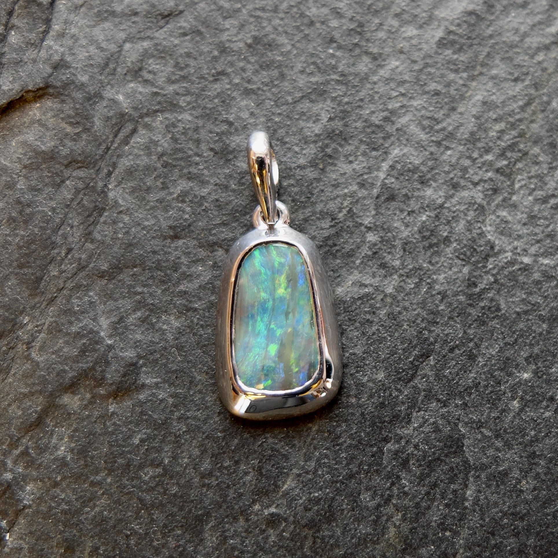 Anhänger mit natürlichem, unbehandelten Boulderopal und Silber AG925. Das Silber wurde rhodiniert um einer Dunkelfärbung vorzubeugen. Es ist eine individuelle Goldschmiedearbeit mit hohen Ansprüchen an die Verarbeitung. Der Stein wurde ordentlich gefasst und nicht eingeklebt. Wunderschön auch am Lederband...